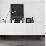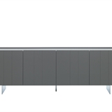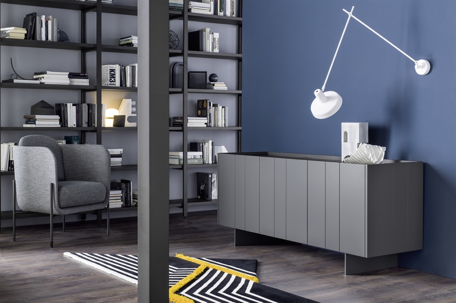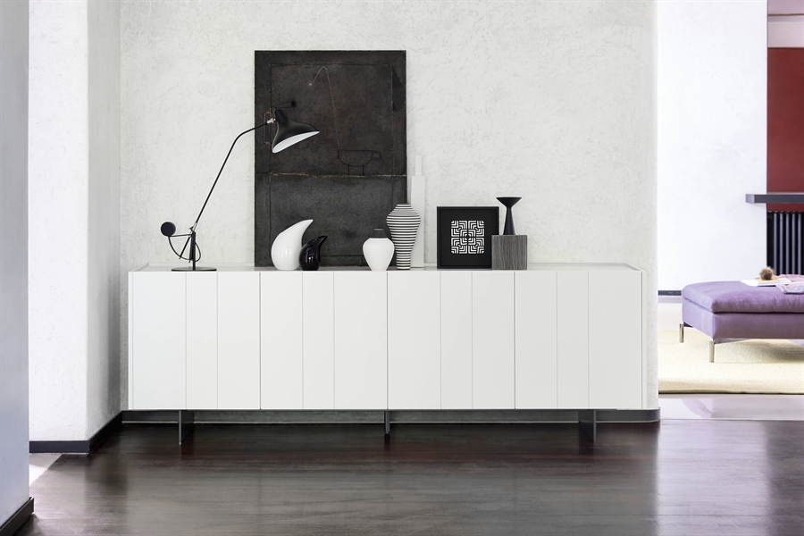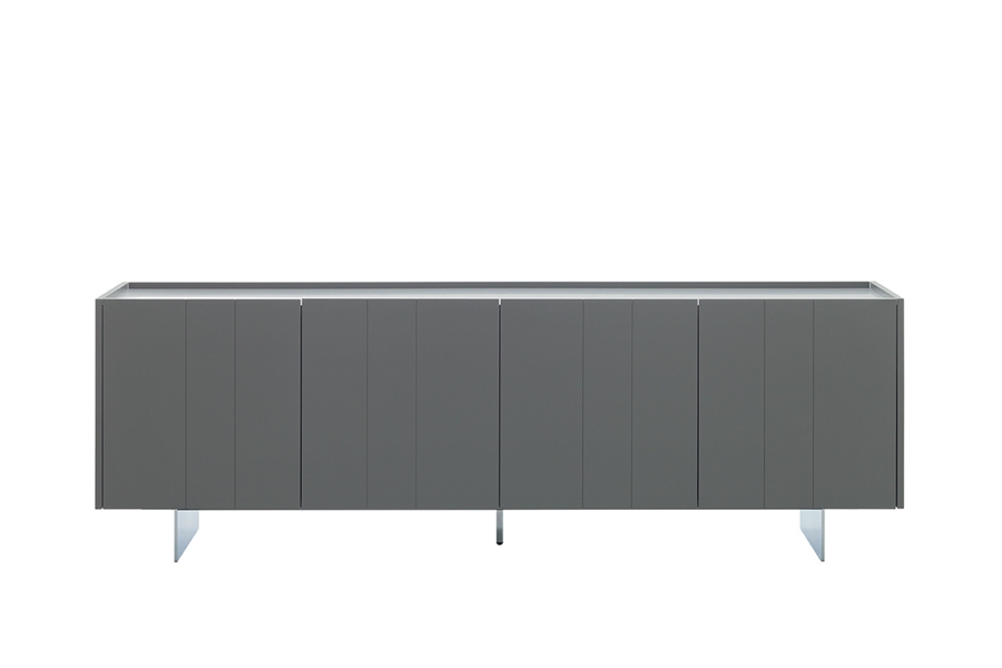 La successione delle linee verticali creano ritmo e movimento. La sporgenza delle ante rispetto al piano ne permette l’apertura. Queste sono le caratteristiche della madia Stripe sorretta da lame verticali in metallo cromato.